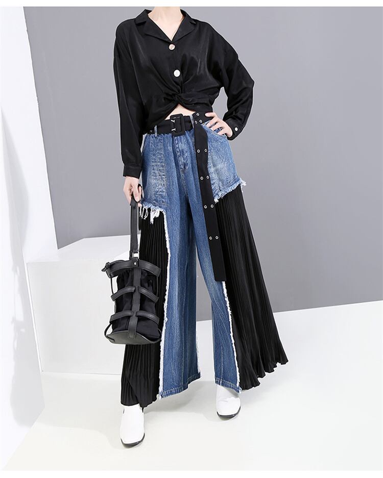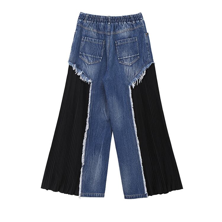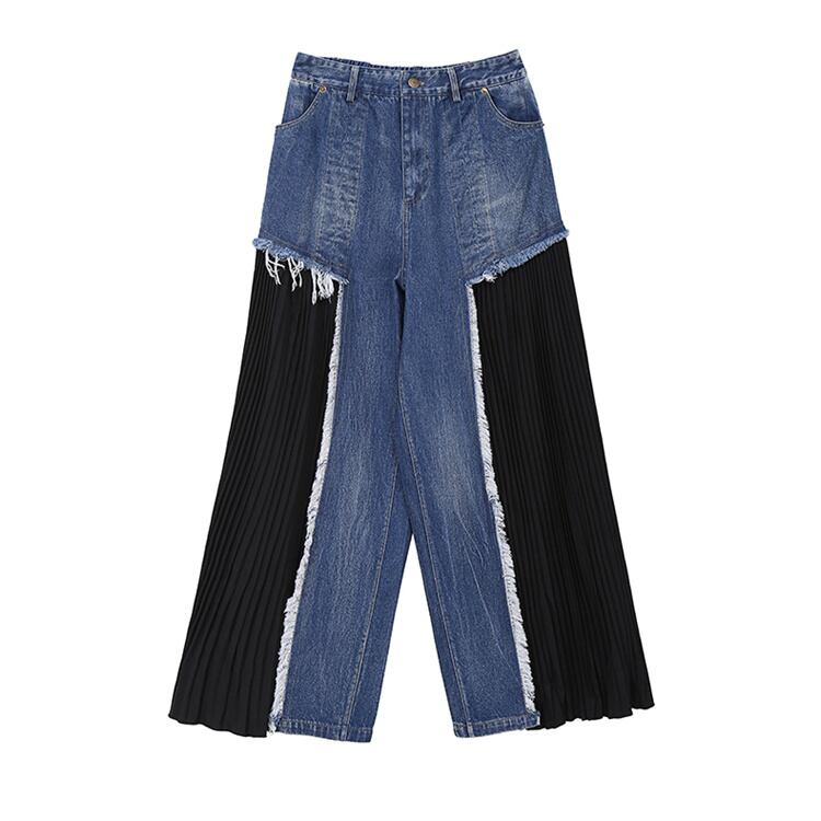 バイカラーでダメージ部分がプリーツになっているデニムパンツ。他にない珍しいデザイン。